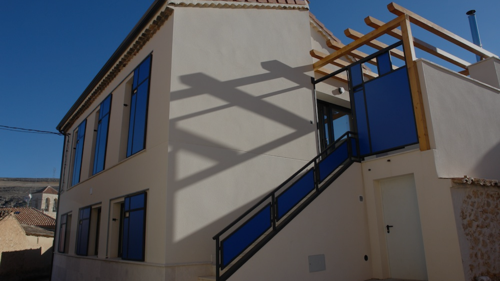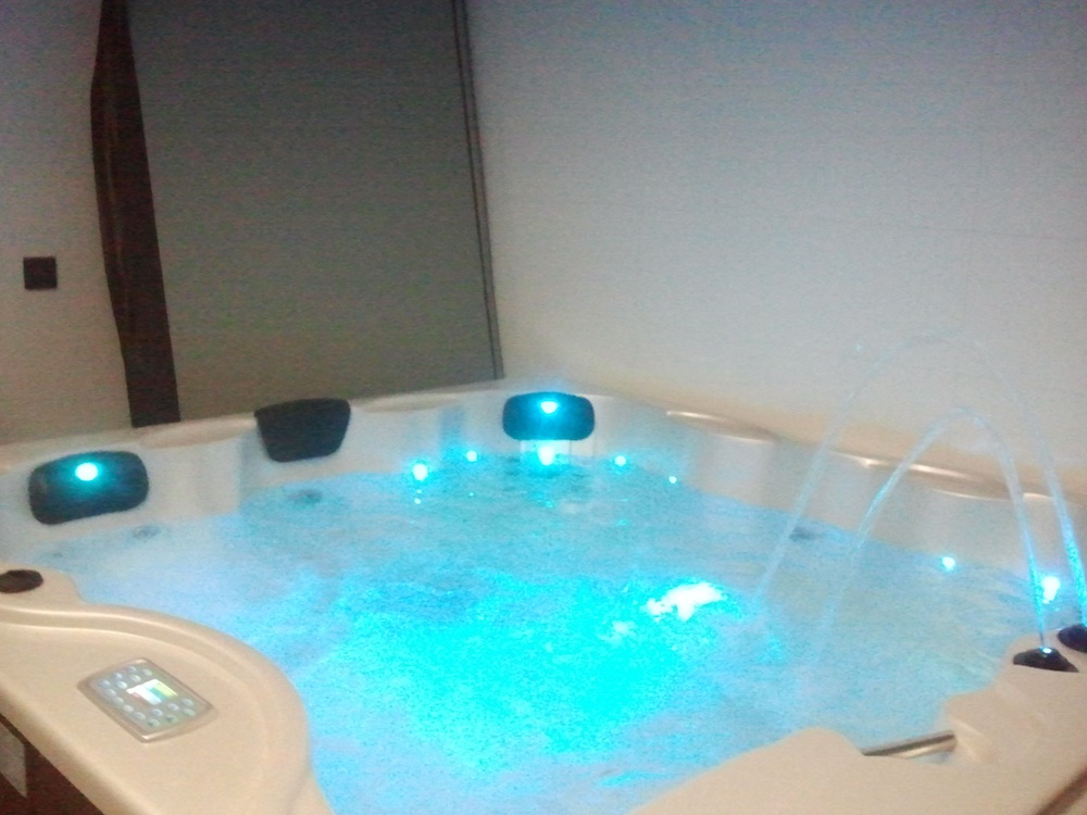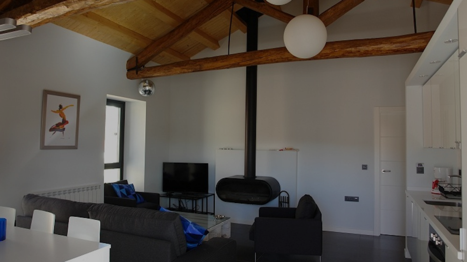 Acceso por terraza soleada en planta alta (ideal para desayunar o barbacoa). Salón con chimenea y cocina en la planta superior, más un dormitorio doble con baño. En la planta baja: dos dormitorios dobles, cada uno con su baño, y zona de jacuzzi/spa. Perfecta para familias o grupos.